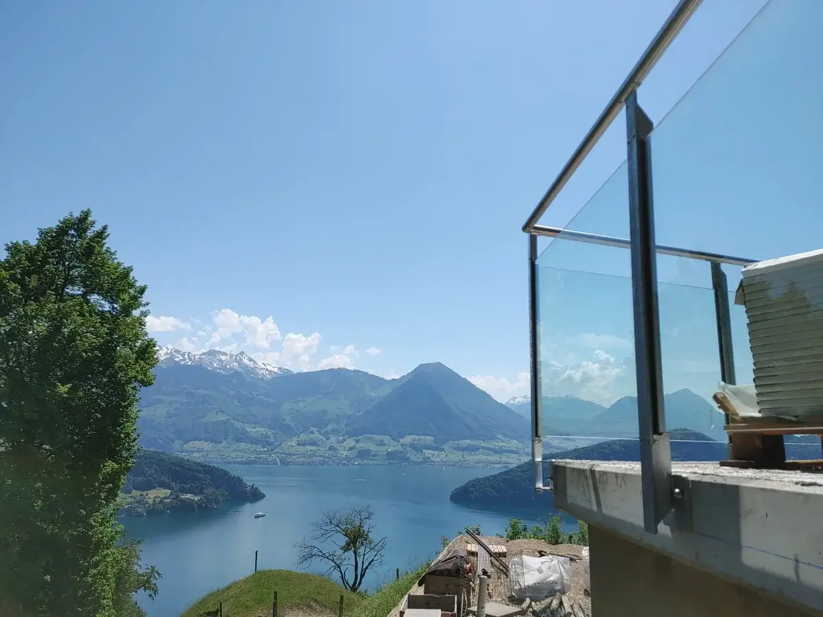 Das Glasgeländer Classic verbindet Eleganz mit Sicherheit – Verbundsicherheitsglas mit Edelstahlhandlauf, statisch geprüft, Swiss Made.