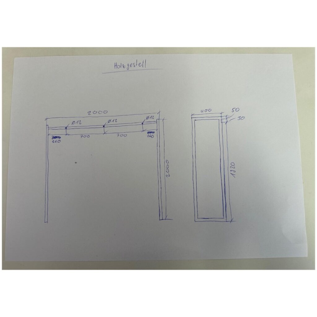 Die Basis für dieses Holzgestell war eine einfache, korrekt vermasste Handskizze des Kunden. Die Skizze wurde vom Kunden selbst erstellt – nach unserer Anleitung unter Skizzieren für die Produktion. So waren alle relevanten Masse, Abstände und Bauteile klar ersichtlich und vollständig für die Produktion definiert.